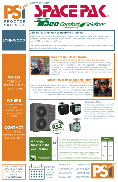 Training lead by Taco and SpacePak experts. Learn how to accommodate air to water heat pumps in a hydronic system, and the installation, operation, and application of SpacePak’s newest R32 Air to Water Heat Pump